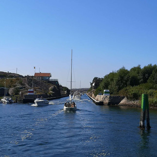 Wir fahren diese Inlandpassage, kurz vor dem Hamburgsund kommt uns das Schweizer Boot Poema Basilea, eine Sirius entgegen. Wir kennen das Boot aus der Vindö Marin, aber deren Eigner nicht Dieser zieht den Hut als wir ihn kreuzen.